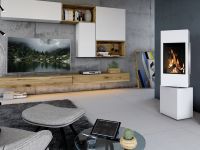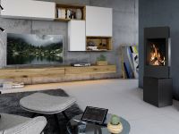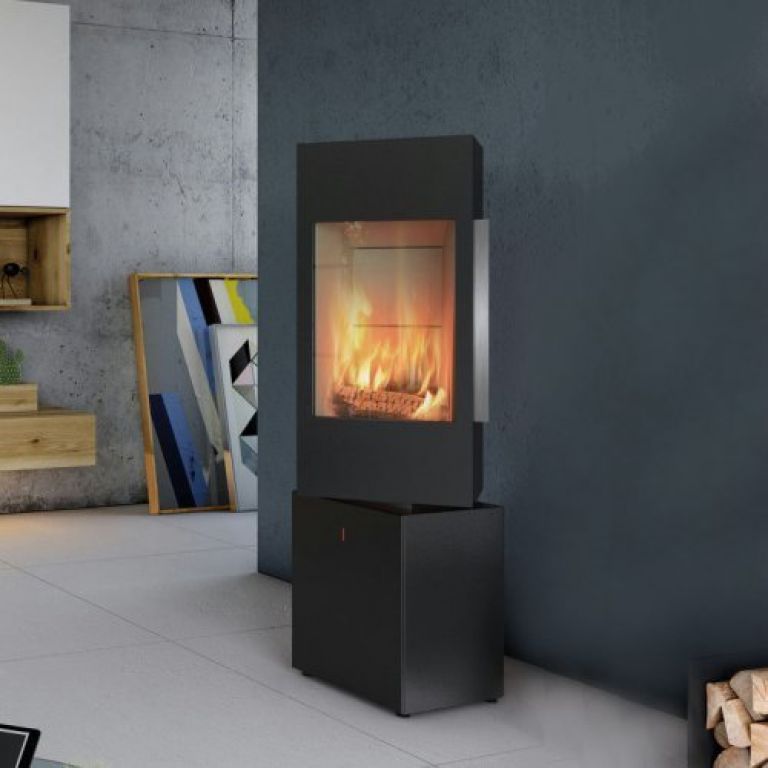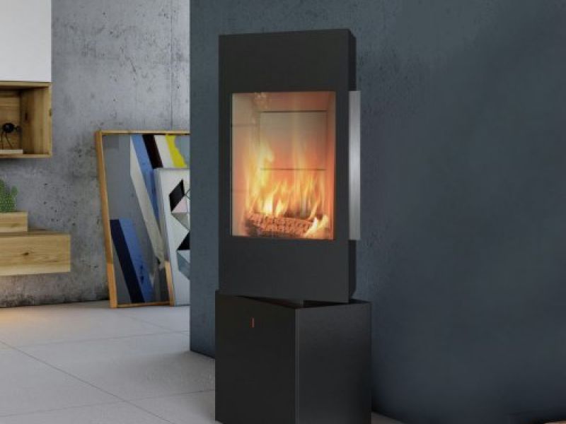 Cet élégant poêle à bois pivotant offre un design moderne : La chambre de combustion peut être tournée d'un angle de 30° vers la gauche et vers la droite.