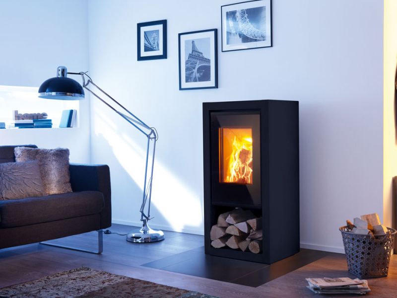 Le Spartherm a7 est un poêle à bois rectangulaire doté d’un pratique espace de rangement des bûches.