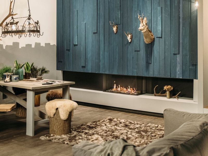 - Vous pouvez décorer les foyers linéaires avec un jeu de bûches réalistes, des galets de Carrare ou des éclats d’ardoise grise.