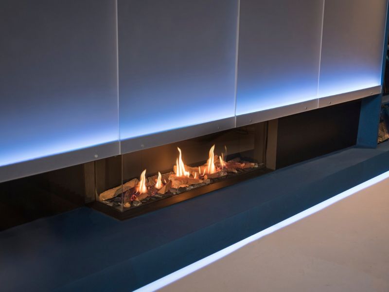 - Vous pouvez décorer les foyers linéaires avec un jeu de bûches réalistes, des galets de Carrare ou des éclats d’ardoise grise.