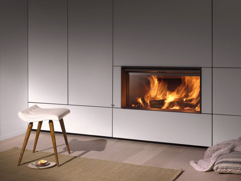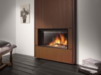 Stuv 22-110 est un foyer bois à vitre escamotable épuré, existant avec de multiples cadres de finition.