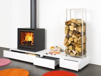 Ce poêle à bois peut être posé sur un socle Stûv, un socle artisanal ou un meuble. Un ventilateur peut être ajouté en option.