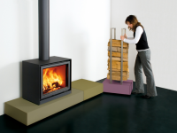 Ce poêle à bois peut être posé sur un socle Stûv, un socle artisanal ou un meuble. Un ventilateur peut être ajouté en option.