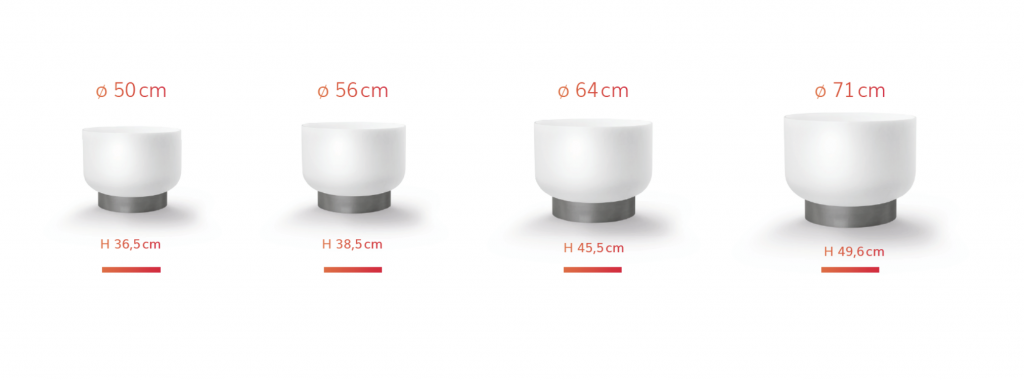 - Une base ronde, ajourée, 10 cm de haut et 45 cm ou 55 cm de diamètre, en acier inoxydable brossé.