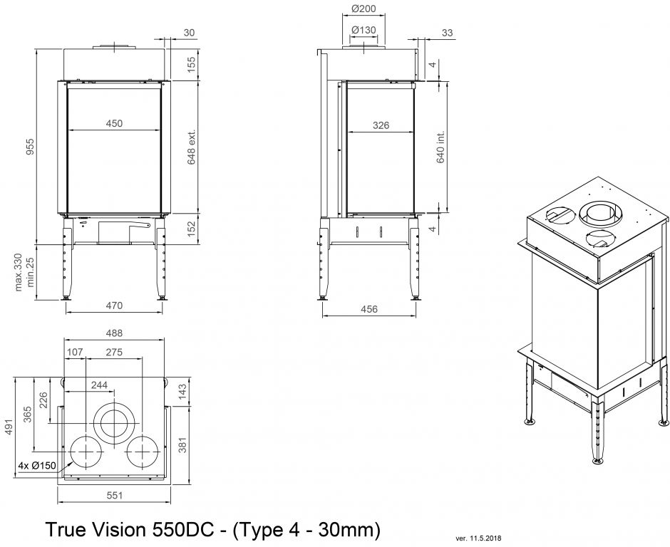 Le True Vision 550 DC est le plus petit modèle de cheminée Gaz de la gamme, double coin vitré. Ce foyer gaz est à encastrer et est conçu en version standard avec une vitre en céramique, un fond en acier noir et un jeu de bûches en céramique. Cette cheminée est équipée de 3 brûleurs, une dans le fond du foyer sous forme de rampe et deux autres extérieurs, permettant d’intégrer deux bûches.