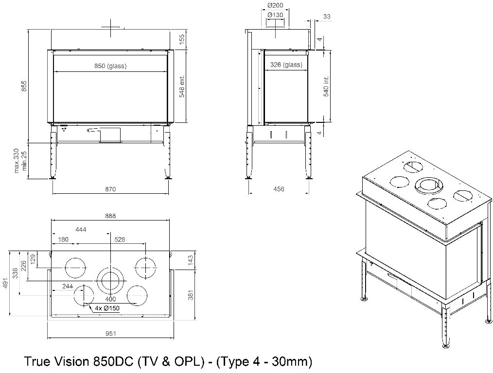 Le True vision 850 DC est un Foyer Gaz à encastrer, conçu avec une vitre à deux coins en céramique, d’une télécommande, d’un jeu de bûches en céramique en forme de feu de camp, et d’un fond en acier noir.