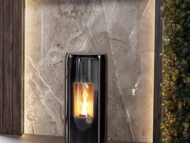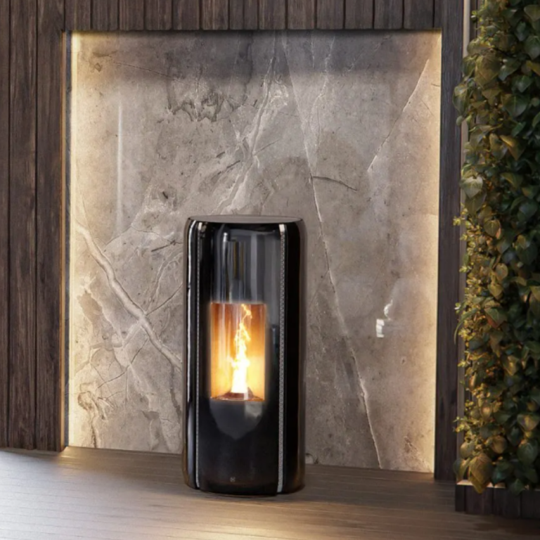 Le poêle à granulé MATISSE combine recherche esthétique et technique, fabriqué en Italie avec un souci artisanal. Son design circulaire et vertical, revêtu de verre trempé noir et de grilles verticales, assure légèreté et dynamisme.