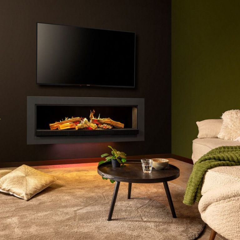 Options | - Cadre Design ou un Mur Média, pouvant être équipés de bandes LED supplémentaires intégrées dans les programmes d'éclairage de la cheminée |