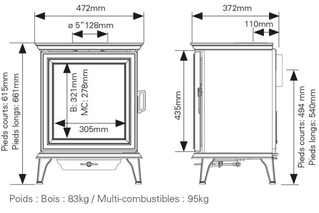 Options | Modèle bois Modèle multi-combustible avec cendrier Kit d'air extérieur Pieds longs de 172mm |