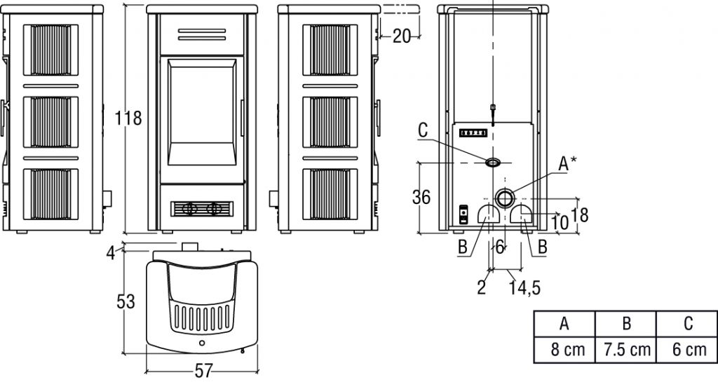 - Chauffage breveté Multifuoco System®, avec 2 ventilateurs pouvant fonctionner séparément, 4 vitesses de ventilation programmables, possibilité de fonctionnement avec programmation de la température ambiante relevée par la télécommande, bouche de sortie d’air chaud frontale en partie basse avec 2 déviateurs de flux, équipé de 2 sorties pour la distribution en partie arrière