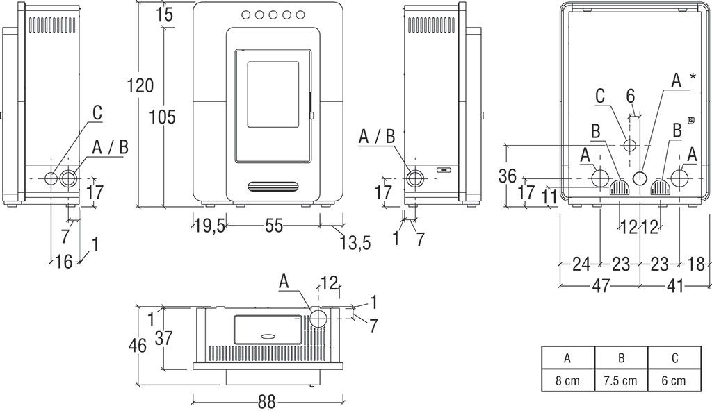 Options | Raccord EDPA Kit de sortie fumées supérieure Kit de sortie fumées latérale (prévoir tuyau 50 diam 80 mm en plus) Kit de sortie fumées arrière gauche (prévoir coude à 90° en plus) Tuyau 50 cm Coude à 90° Adaptateur diamètre 80 mm (pour sortie arrière du modèle) Grille pour distribution latérale Module Wi-Fi system |