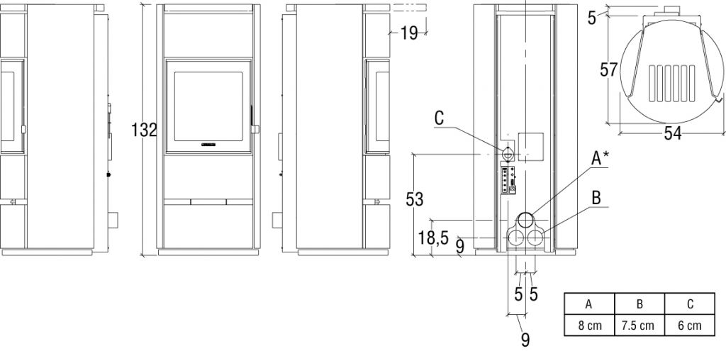 - Chauffage breveté Multifuoco System®, avec 2 ventilateurs pouvant fonctionner séparément, 4 vitesses de ventilation programmables, possibilité de fonctionnement avec programmation de la température ambiante relevée par la télécommande, bouche de sortie d’air chaud frontale en partie basse avec 2 déviateurs de flux, équipé de 2 sorties pour la distribution en partie arrière