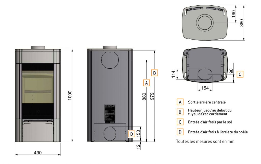 Options | Gaine flexible noire diamètre 100 mm pour raccordement air Cache noir sortie de fumée supérieure (pour installation sortie arrière) Cache blanc sortie de fumée supérieure (pour installation sortie arrière) Kit de raccordement pour prise d'air directe |