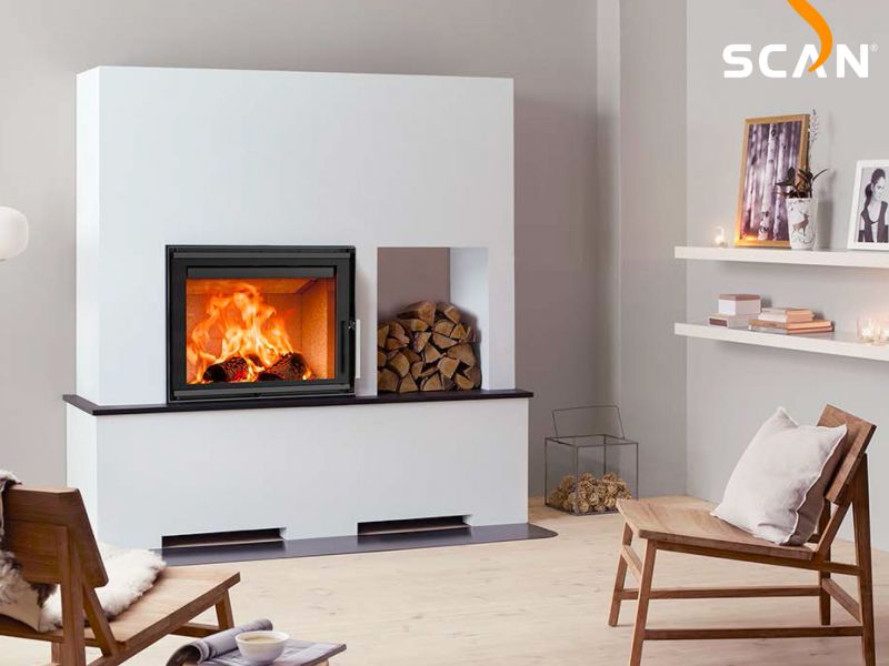 Le foyer à bois Scan 5002 est doté d'une vitre horizontale et peut accueillir des bûches de 45 cm.