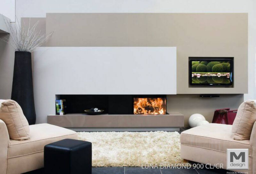 La Cheminée Bois Luna Diamond 900 CL ou CR est un foyer bois avec un coin vitré de M-Design. Ces modèles de foyers bois de la gamme Luna Diamond, sont conçus d’une vitre escamotable avec un angle droit (CR) ou gauche (CL) et d’un intérieur au choix en acier ou en fonte. Le pare feu n’est pas disponible pour les modèles avec coin. La finition de la vitre est d’une pureté absolue. La vitre est conçue en une seule pièce, en verre plié. Les Luna Diamond avec coin sont livrés avec un cadre standard, intérieur de finition de 6,8 centimètres.