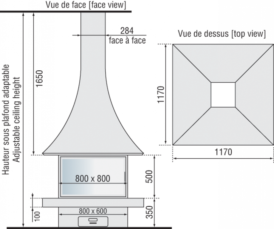 Options | Version centrale peinte 117 x 117 cm plateau briqueté ou tout métal, (épaisseur 10 cm) Version peinte 100 x 100 cm, socle 110 x 110 cm tout métal, (épaisseur 5 cm) Socle effet ciré (couleurs : blanc cassé, noir ébène, gris, taupe, chocolat) Socle vide, (sans briques), finition à réaliser par vos soins Rehausse de socle, (20 cm maximum) Rallonge de conduit non laqué , (au-delà de 2,5 M et pour 1 M supplémentaire) Bandeau de socle laqué uni Platine cache plafond Fixation pour cheminée centrale Caisse bois Transport cheminée jusqu'à 4 M de hauteur sous plafond Transport cheminée grande hauteur, (plus de 4 M de hauteur sous plafond) |