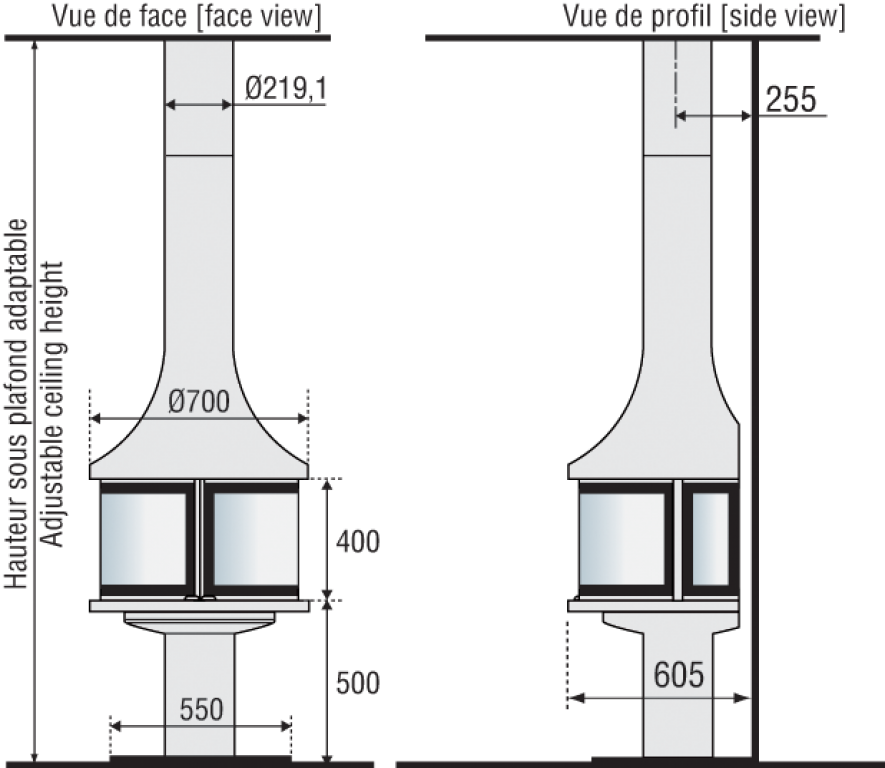 Options | Existe en version sérigraphiée (filets verre noir et rebord de hotte plat) Existe en version classique (verre blanc et rebord de hotte en biseau) Pied central pour cheminée de 50 cm Rallonge de conduit non laqué , (au-delà de 2,5 M et pour 1 M supplémentaire) Platine cache plafond Outside air Fixation pour cheminée murale Caisse bois Transport cheminée jusqu'à 4 M de hauteur sous plafond Transport cheminée grande hauteur, (plus de 4 M de hauteur sous plafond) |