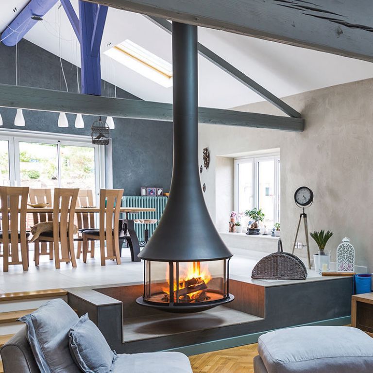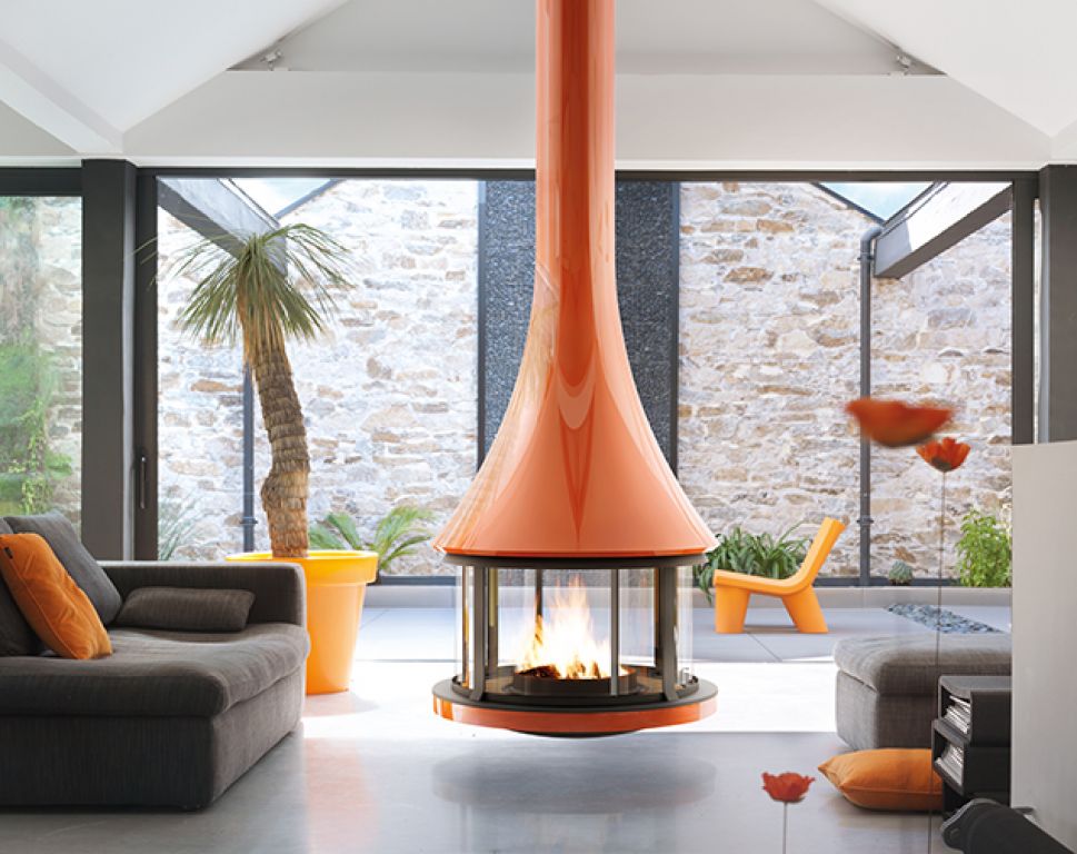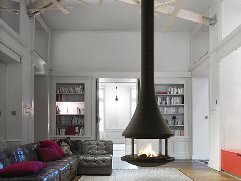 La cheminée centrale et suspendue Zelia 908 est d'une élégance remarquable.