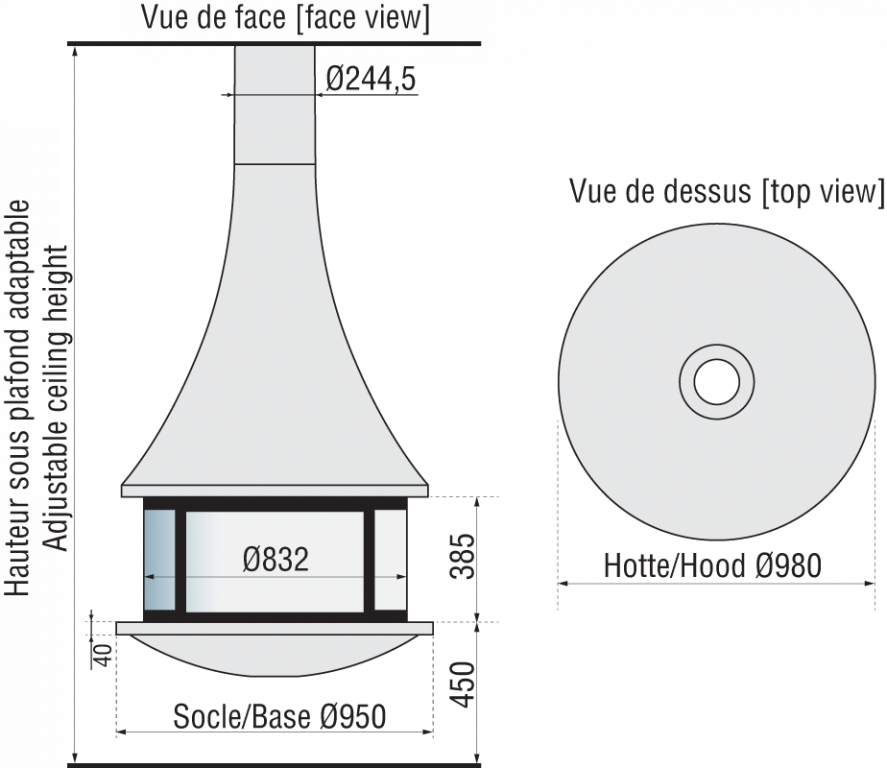 Options | Existe en version sérigraphiée (filets verre noir et rebord de hotte plat - Socle briqueté incompatible) Existe en version classique (verre blanc et rebord de hotte en biseau) Existe en version foyer fermé - Color laquée unie, brut ou vernis foncé Rallonge de conduit non laqué , (au-delà de 2,5 M et pour 1 M supplémentaire) Rallonge de conduit laqué, uni, (au-delà de 2,5 M et pour 1 M supplémentaire) Platine cache plafond Fixation pour cheminée centrale Caisse bois Transport cheminée jusqu'à 4 M de hauteur sous plafond Transport cheminée grande hauteur, (plus de 4 M de hauteur sous plafond) |
