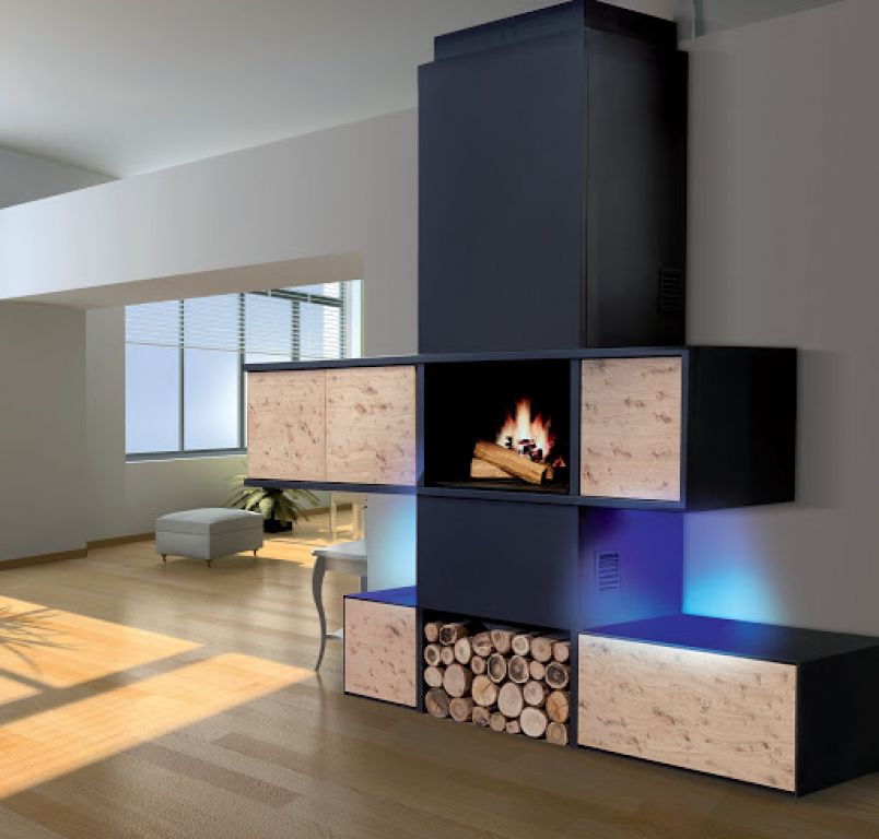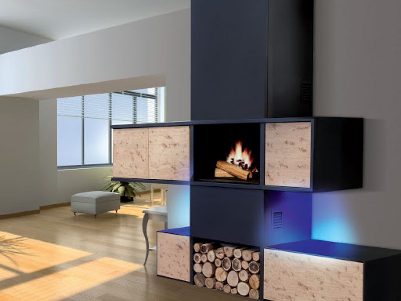 Cheminée living modulable, tiroir push pull , portes plaqué chêne flammé, habillage noir